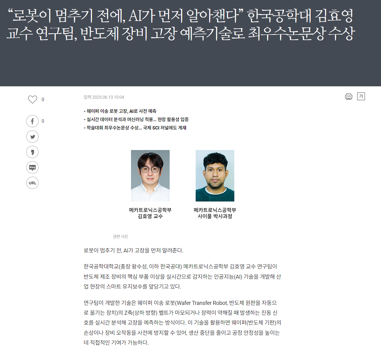 로봇이 멈추기 전, AI가 고장을 먼저 알려준다. 한국공학대학교(총장 황수성, 이하 한국공대) 메카트로닉스공학부 김효영 교수 연구팀이 반도체 제조 장비의 핵심 부품 이상을 실시간으로 감지하는 인공지능(AI) 기술을 개발해 산업 현장의 스마트 유지보수를 앞당기고 있다.